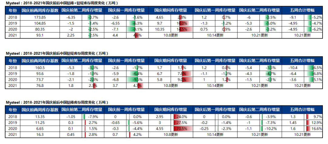 縱觀近4年國慶期間鋁錠、鋁棒庫存的變化,可以明顯發(fā)現(xiàn)國慶期間庫存累積概率較大,由于貨物持續(xù)運至倉庫內(nèi),而企業(yè)在假期提貨頻率顯著減少,造成階段性庫存累積,而累庫幅度根據(jù)國慶節(jié)前庫存變化不等,其中2020年國慶節(jié)前一周鋁錠+鋁棒去庫7.1萬噸,而國慶期間累庫10.35萬噸,反差最為強烈。